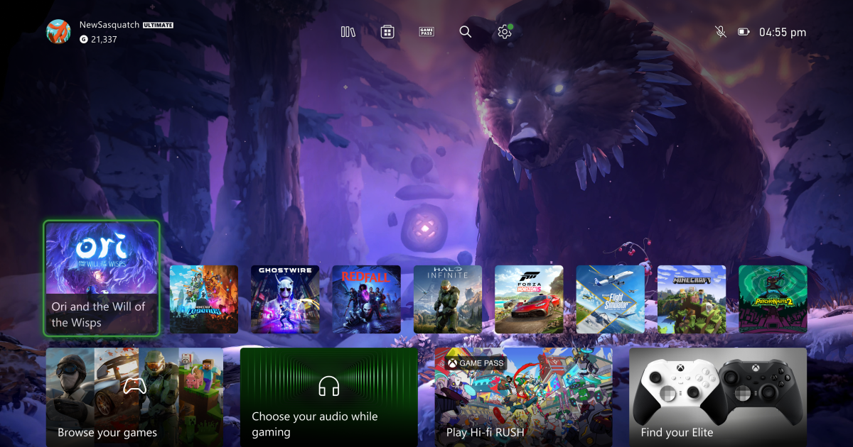 Scrolling across the list of tiles will make the one you've selected larger (as Ori is in the image at the top of the page). A central upper navigation has also been added, allowing easy access in just a few taps to the Xbox's game library, store, Game Pass hub, search functionality and settings app.